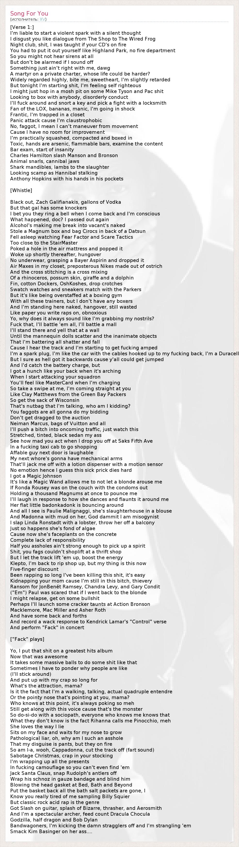 43 – Ссылка на песню "Заср*нец" (Asshole). Также обыгрывается знаменитая фраза "liar, liar, pants on fire" (лжеца видно по горящим штанам). С одной стороны штаны Эминема скрывают то, что он заср*нец в буквальном смысле, с другой – его штаны "горят" и он не может скрыть то, что он лжец.
