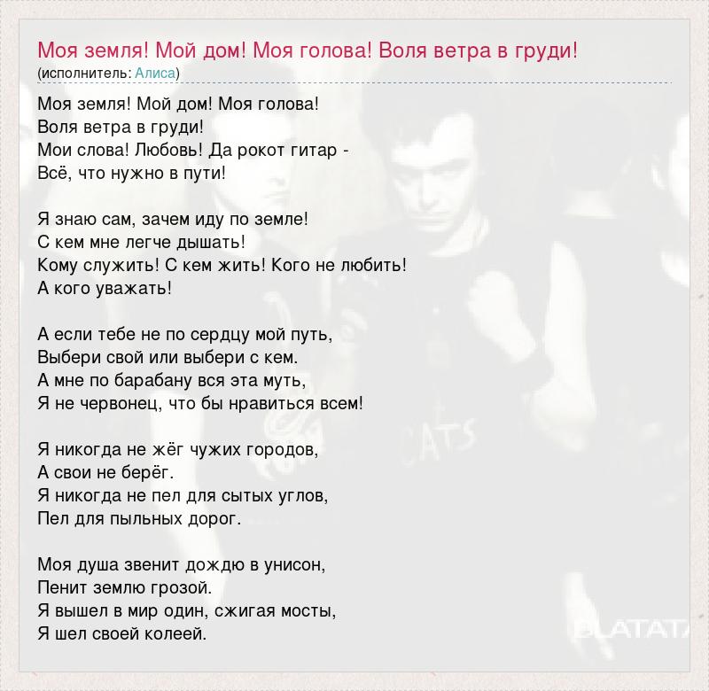 Моя земля! Мой дом! Моя голова! Воля ветра в груди! Мои слова! Любовь! Да рокот гитар - Всё, что нужно в пути! Я знаю сам, зачем иду по земле! С кем мне легче дышать! Кому служить! С кем жить! Кого не любить! А кого уважать! А если тебе не по сердцу мой путь, Выбери свой или выбери с кем. А мне по барабану вся эта муть, Я не червонец, что бы нравиться всем! Я никогда не жёг чужих городов, А свои не берёг. Я никогда не пел для сытых углов, Пел для пыльных дорог. Моя душа звенит дождю в унисон, Пенит землю грозой. Я вышел в мир один, сжигая мосты, Я шел своей колеей.