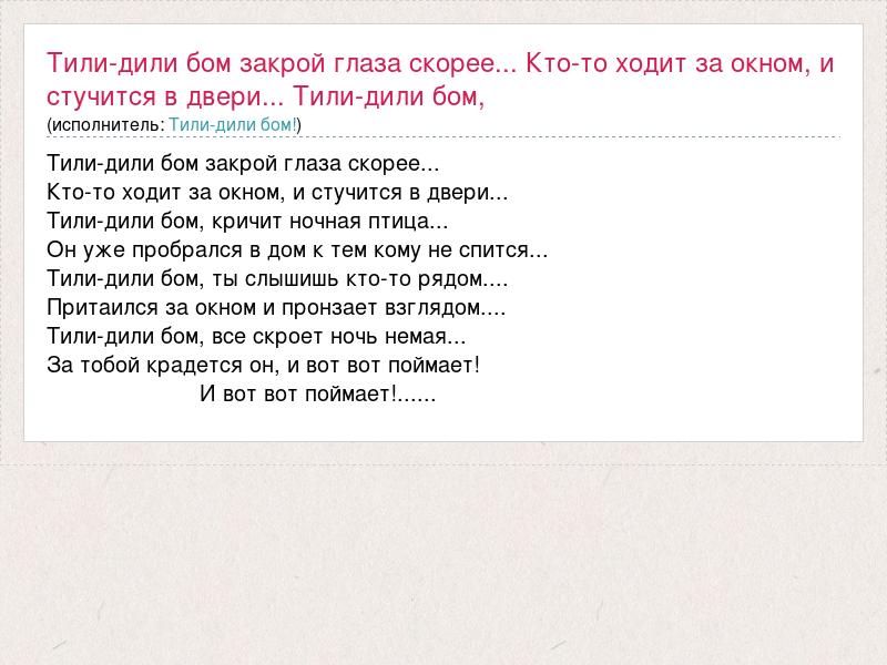 Главная→Исполнители→Тили-дили бом!→Тили-дили бом закрой глаза скорее... Кто-то ходит за окном, и стучится в две